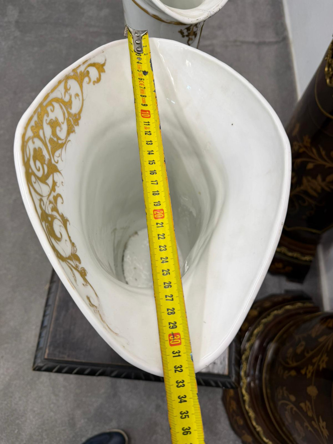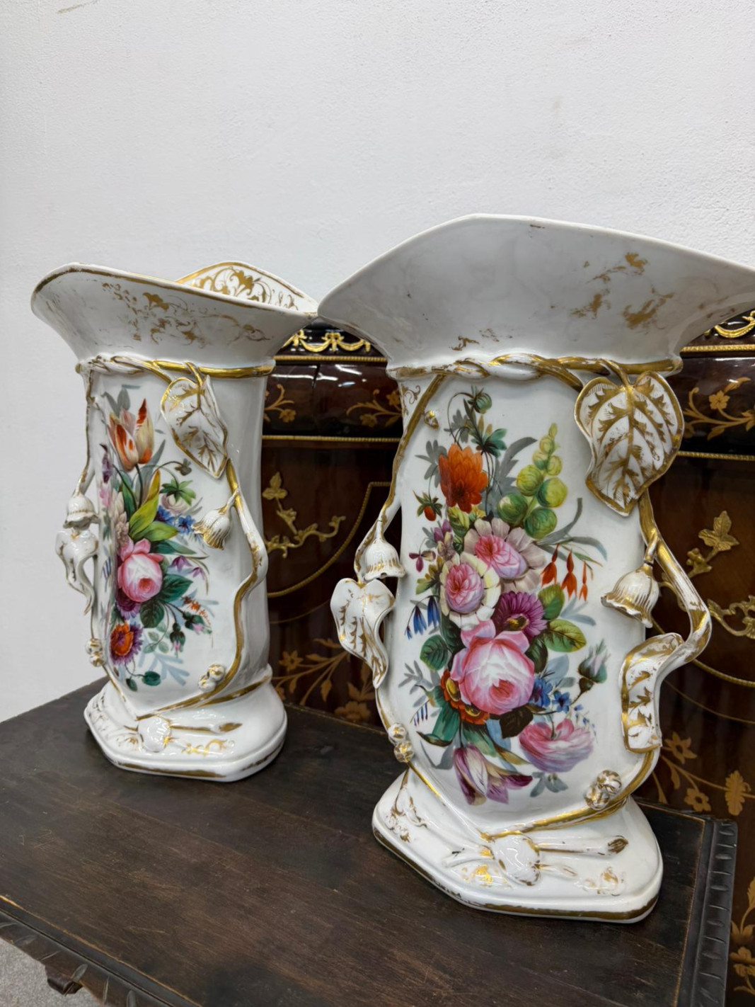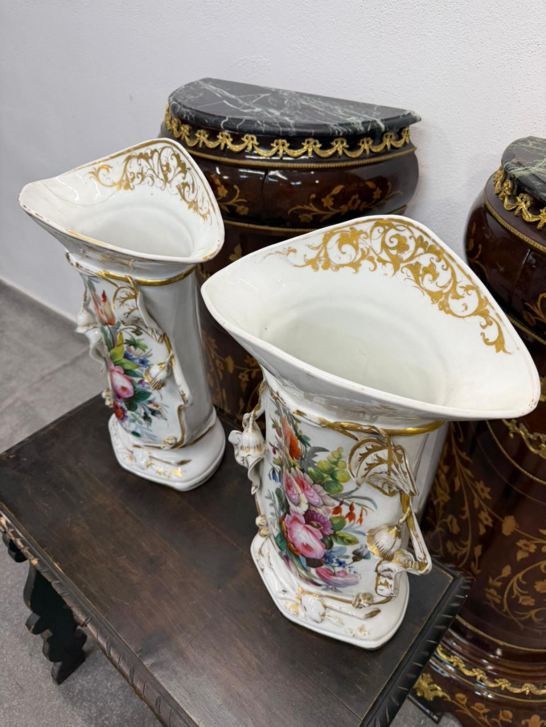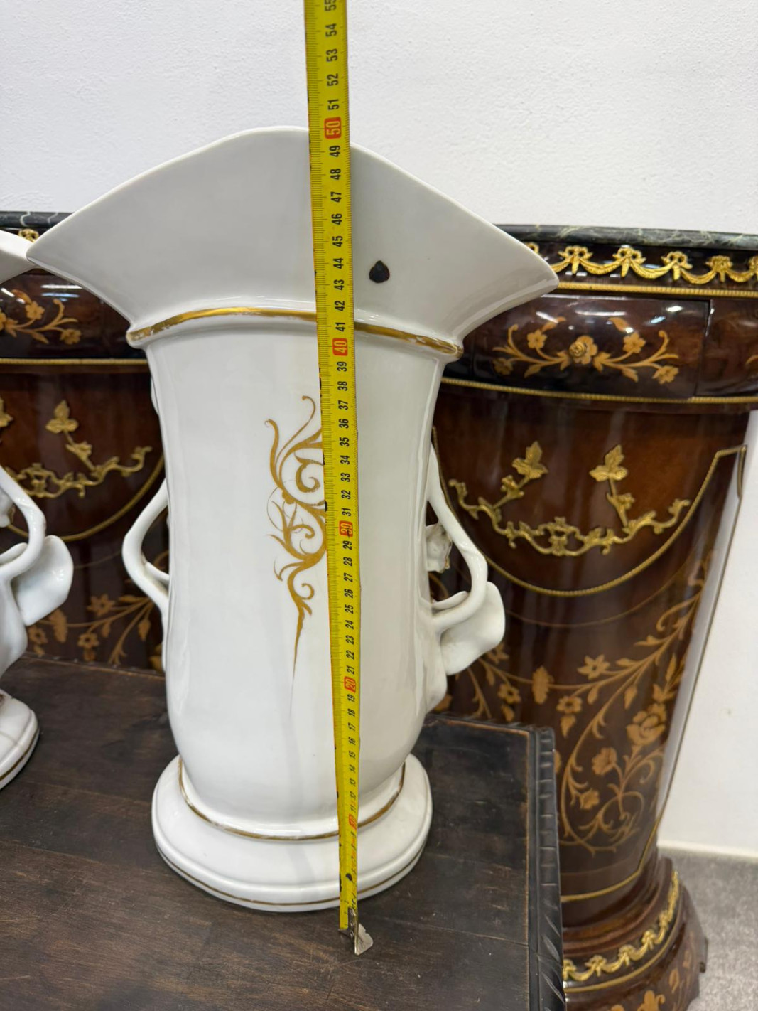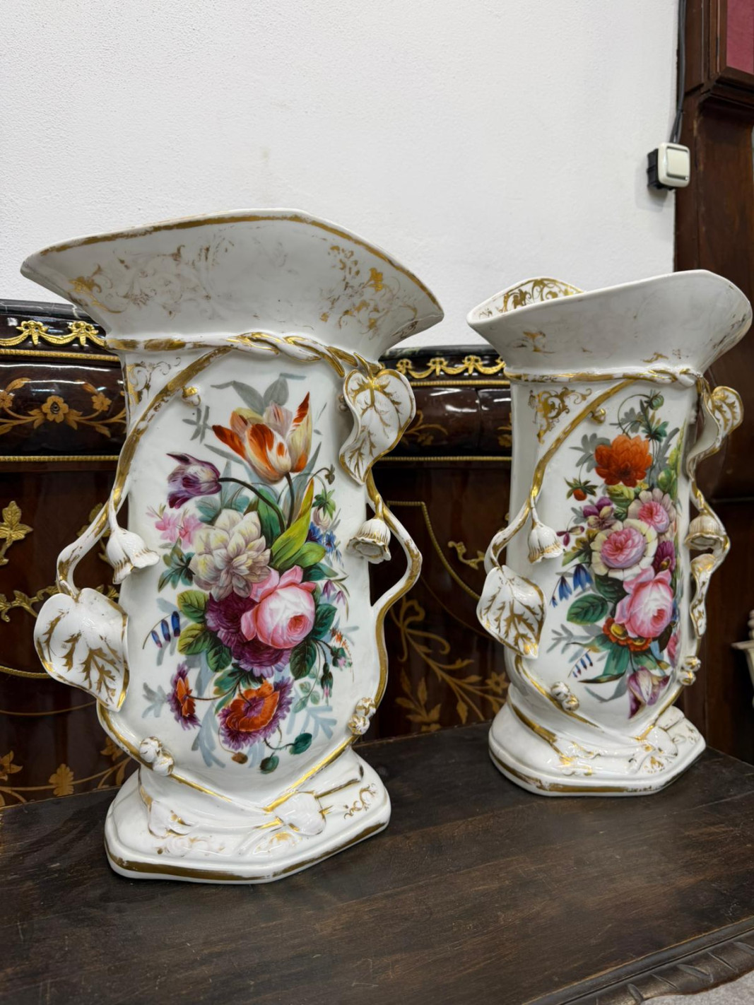 Gran pareja de jarrones isabelinos S. XIX, con motivos florales y asas con forma de ramas, todo con detalles dorados.