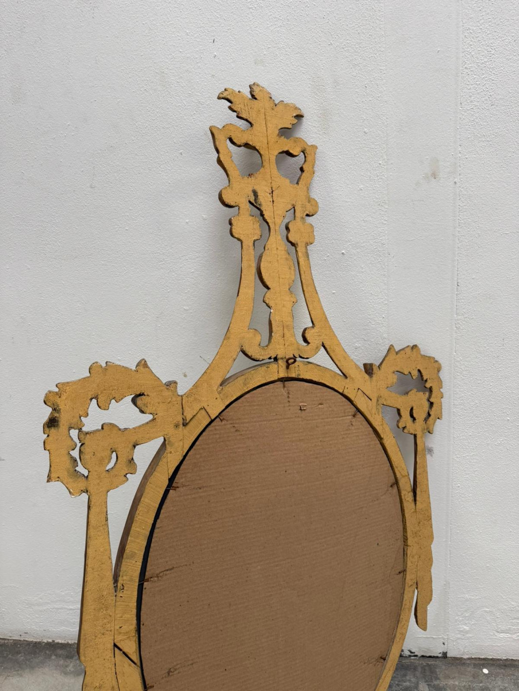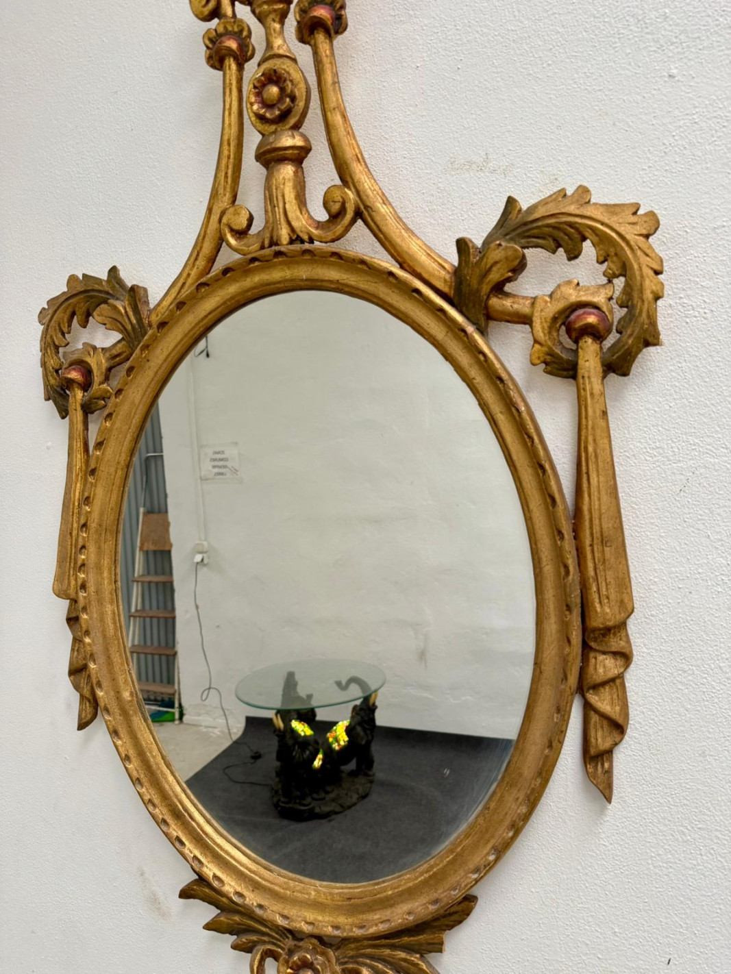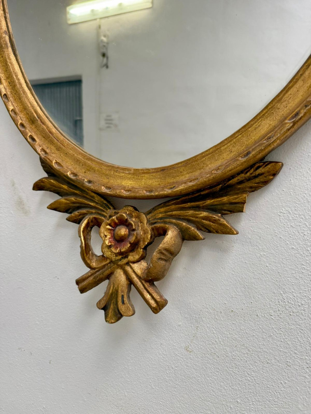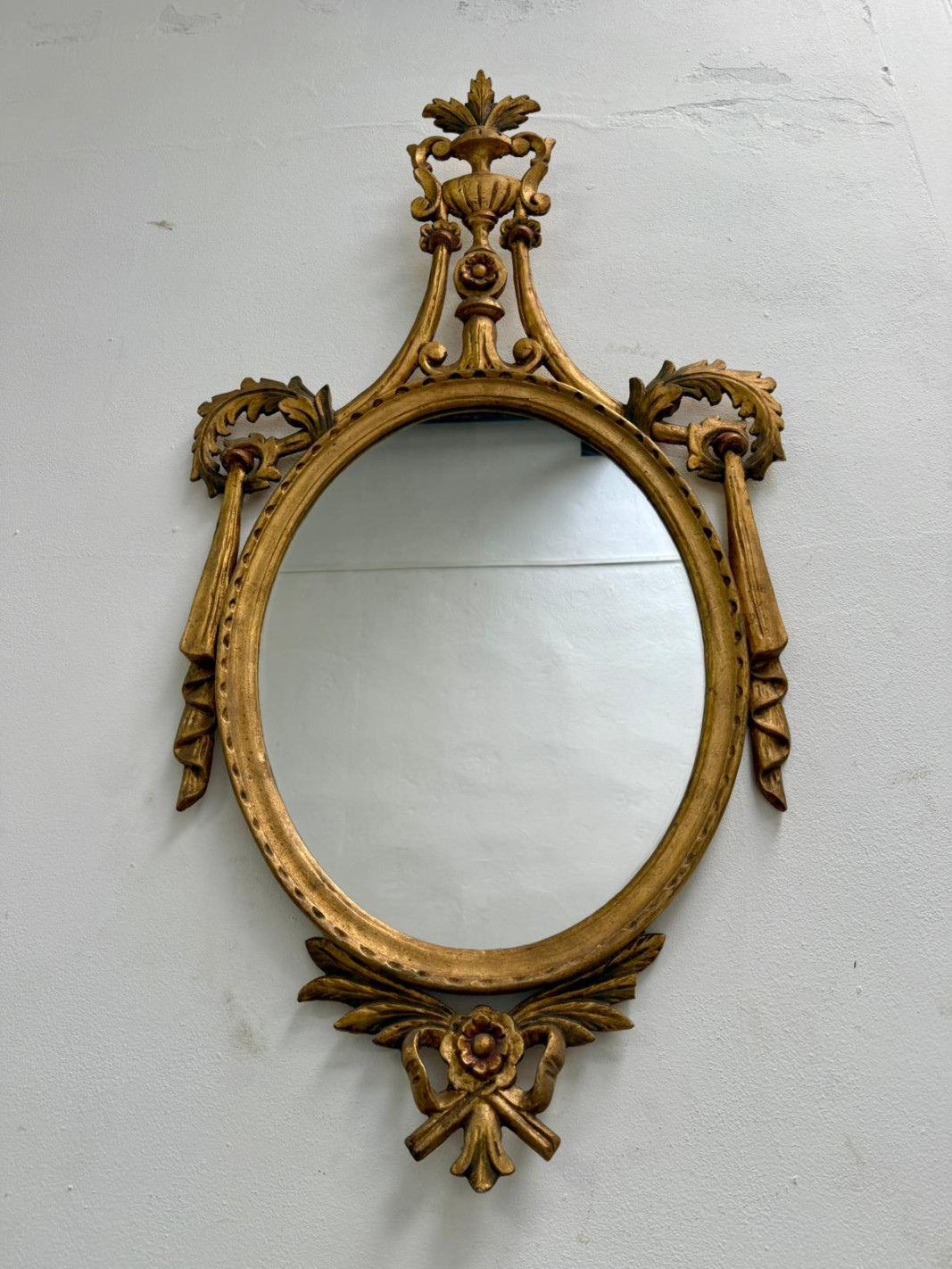 Bonito espejo tallado en madera con penacho, copa y lazos a los lados.