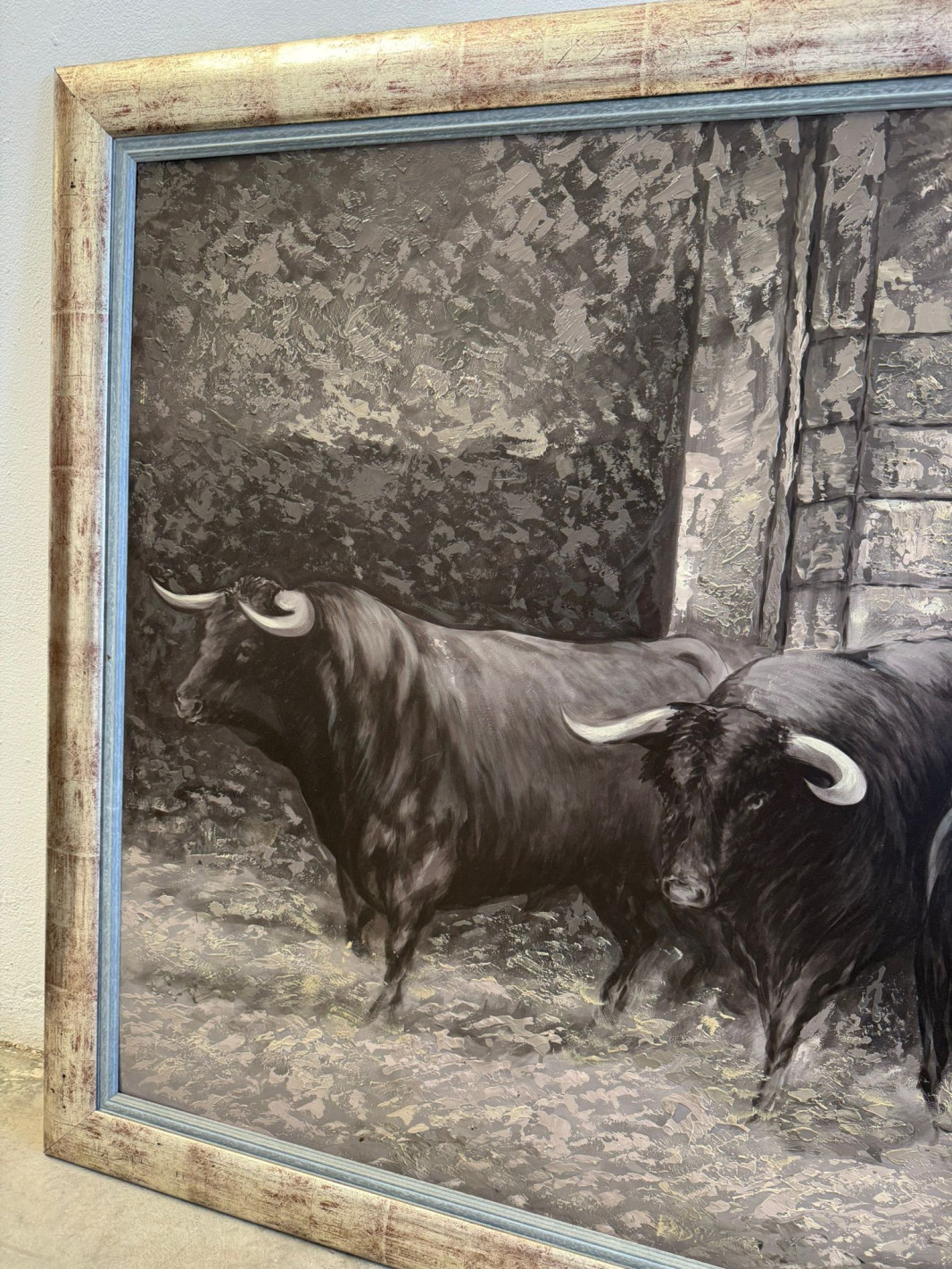 Toros bravos en el campo, pintados sobre tabla por el pintor jerezano Juan Lara.