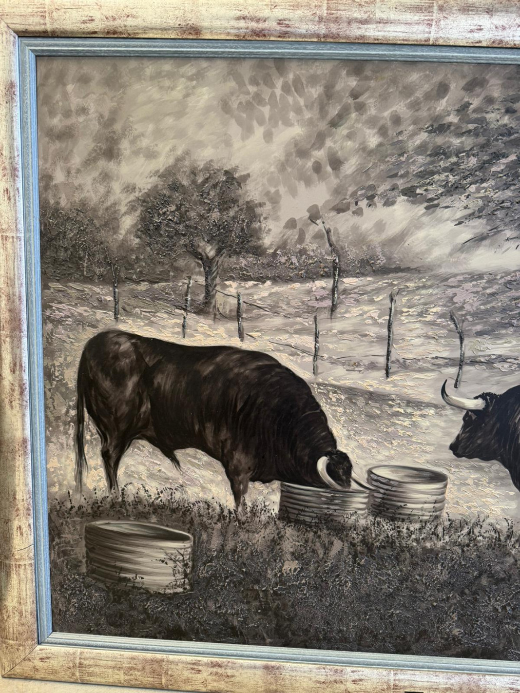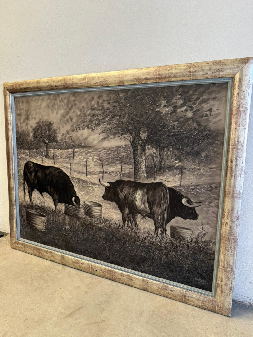 Toros bravos en el campo, pintados sobre tabla por Juan Lara.