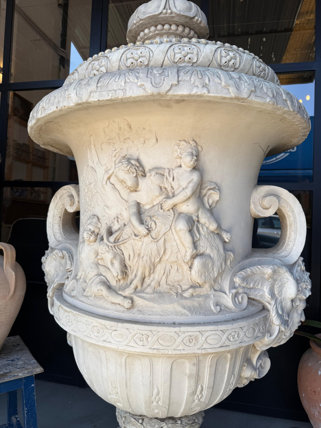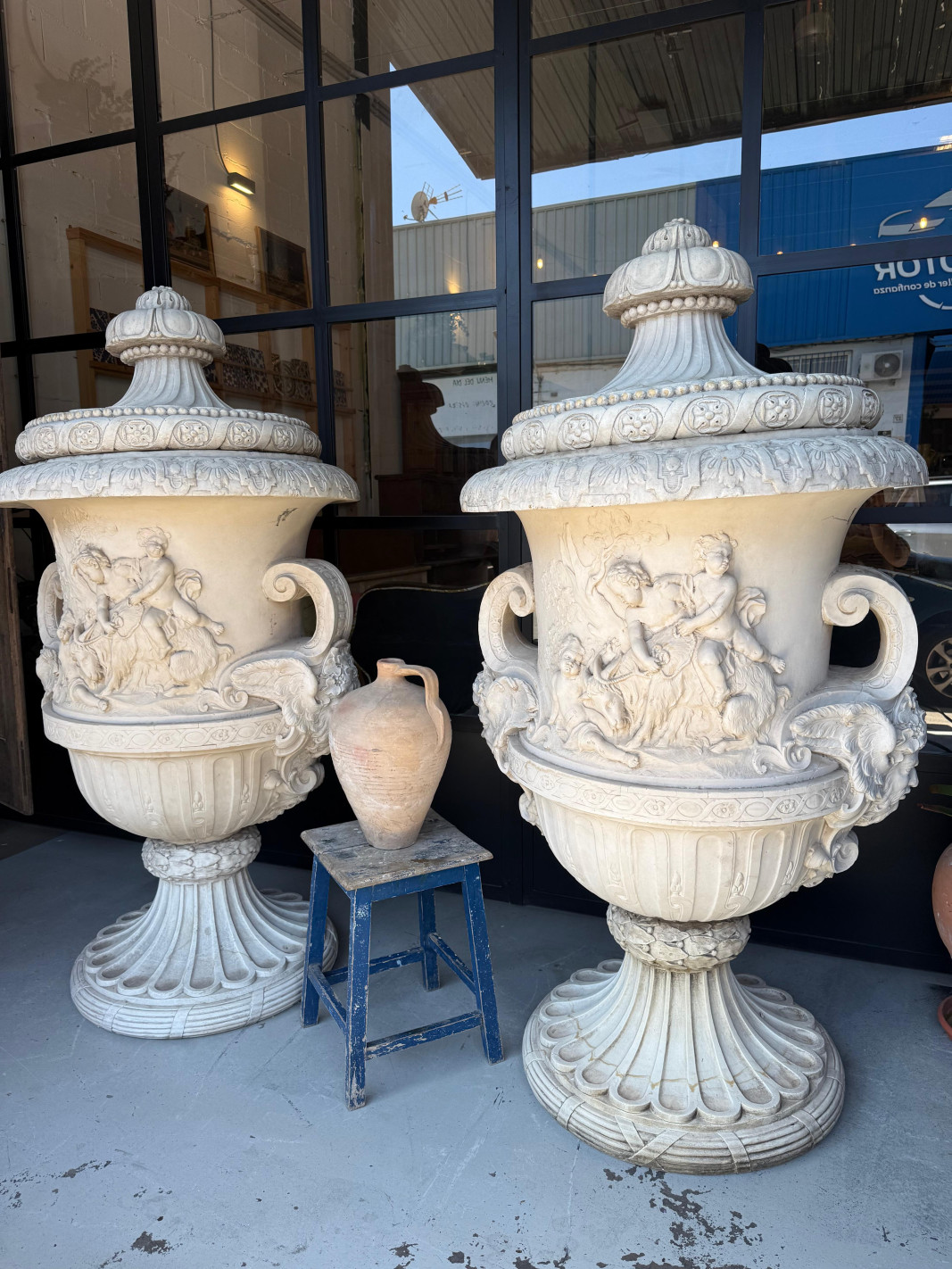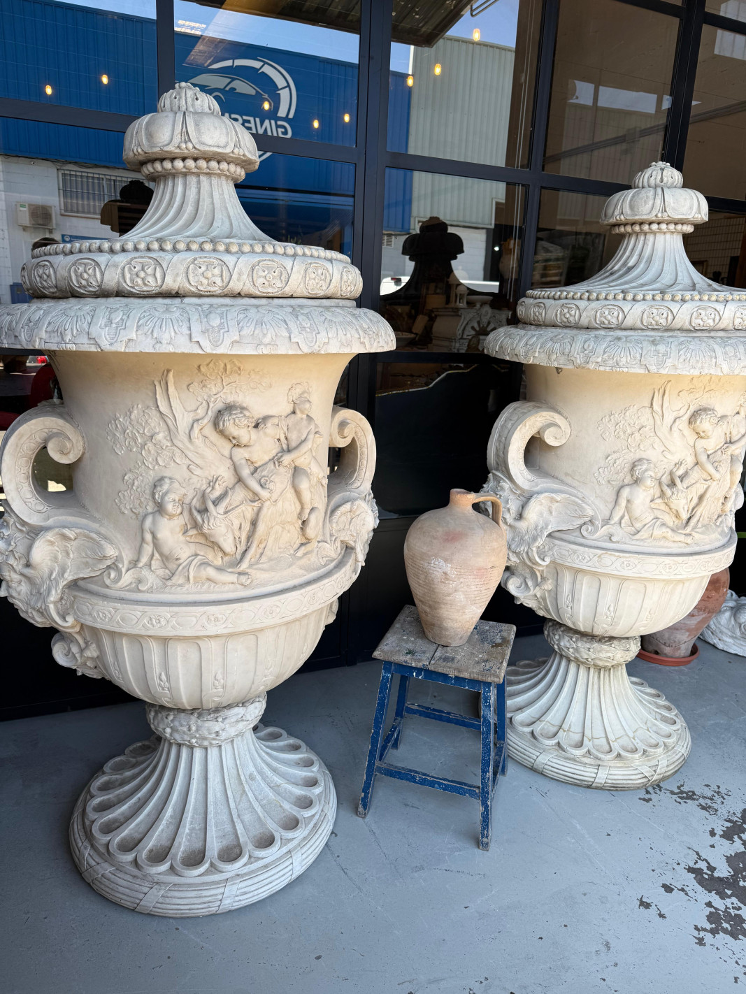 Gran pareja de copas en piedra artificial.